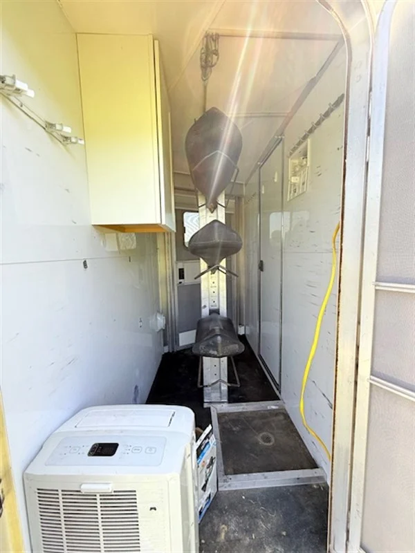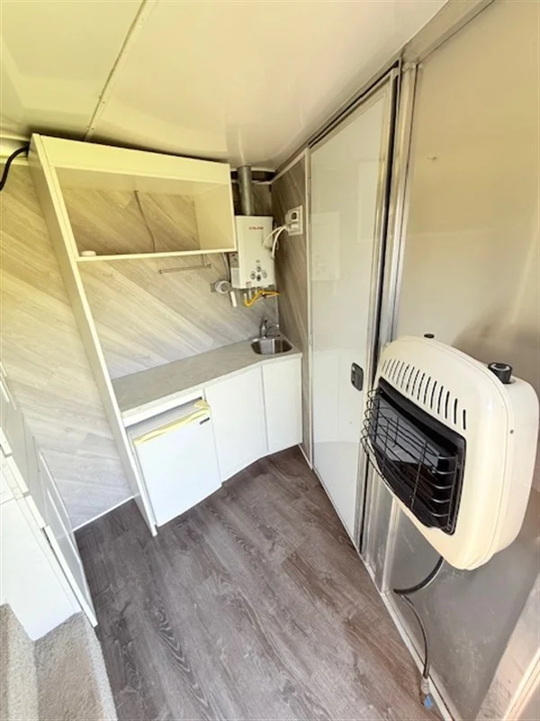 The mid tack area includes saddle racks that can be moved to the rear tack area and features a shower setup with a curtain and shower head, complete with an Insta-Hot water heater. The front weekender area is simple but functional, including a sink, ample cabinet storage, a portable A/C unit that vents into the rear of the trailer, and a propane wall heater.