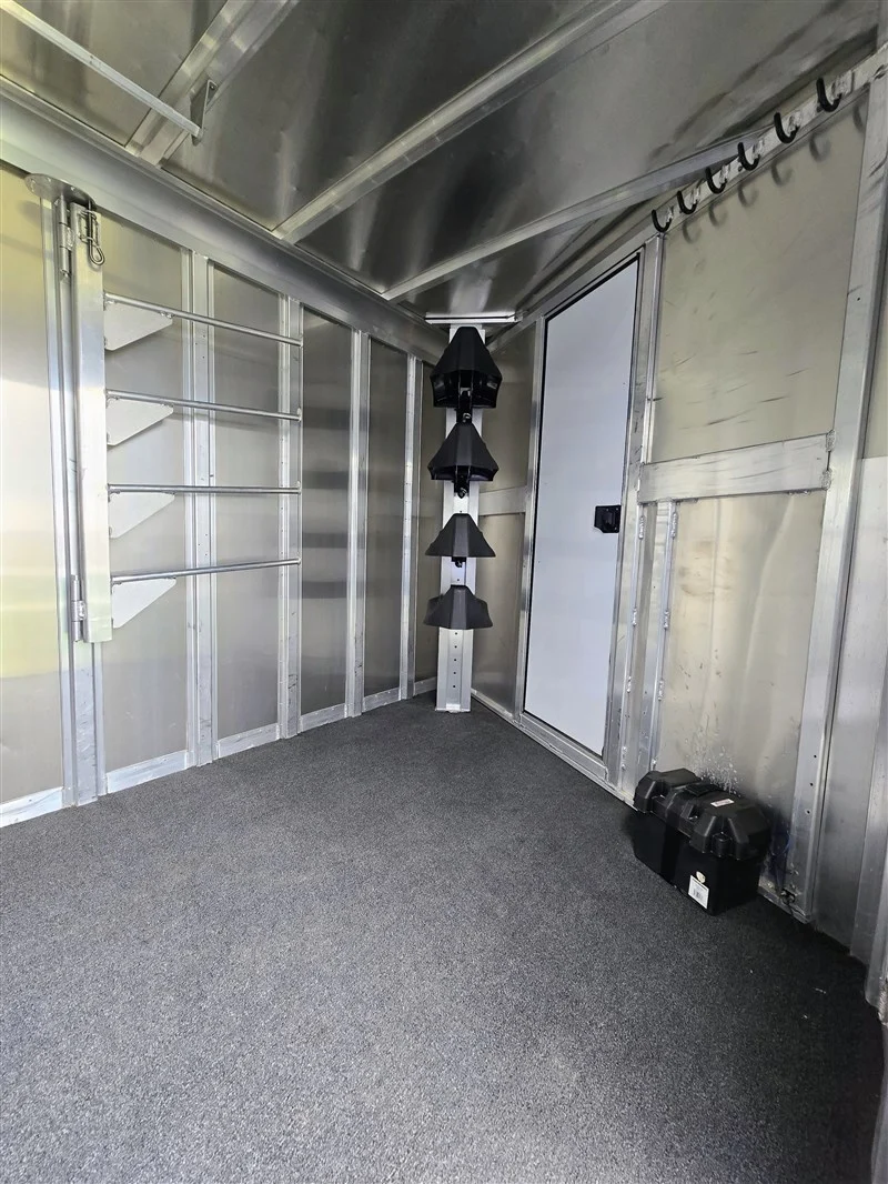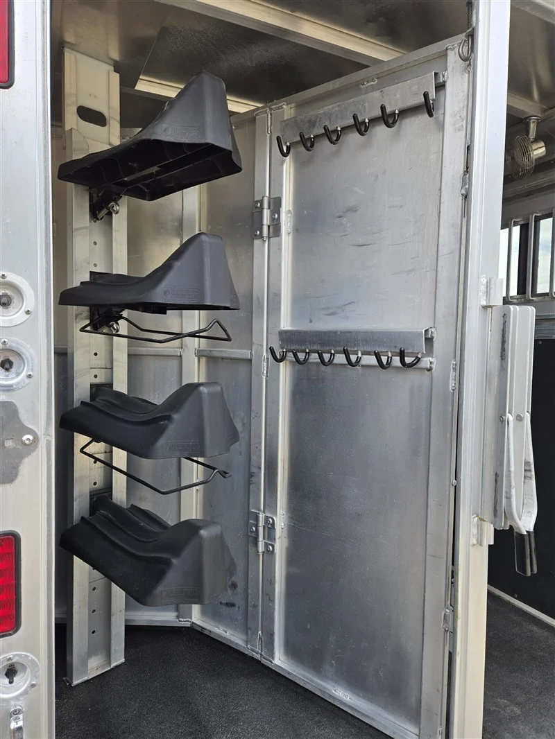 • Pass-through door, adjustable (4) saddle racks, 6-hook bridle bar, 5-position swinging blanket bar, and aluminum clothes rod